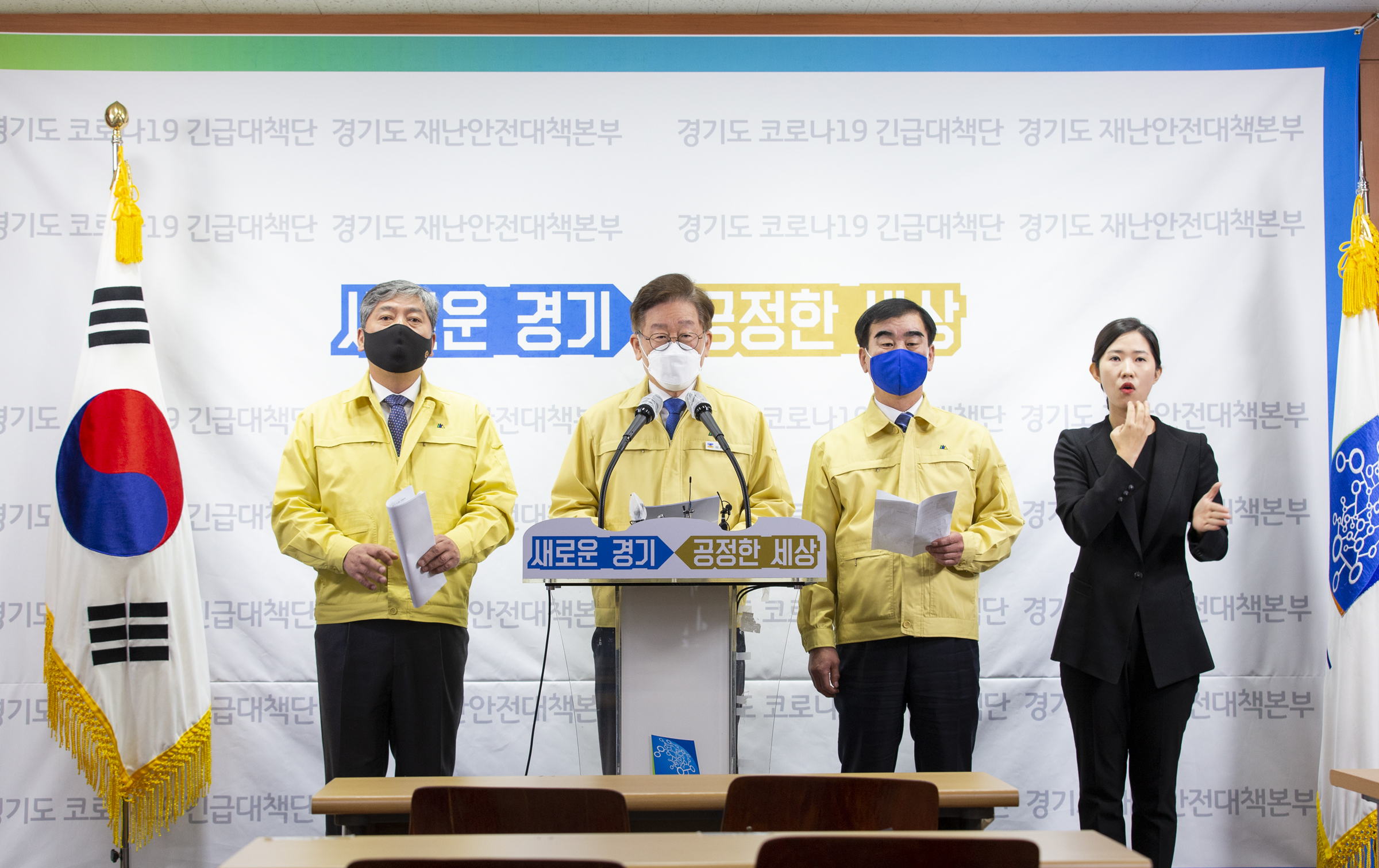 이재명 경기도지사는 24일 경기도청에서 기자회견을 열고 “코로나19로 맞게 된 역사적 위기 국면에서 위기를 기회로 만들며 새로운 시대를 준비해야 한다”며 경기도형 재난기본소득 지급 계획을 밝혔다. 이 자리에는 송한준 경기도의회 의장과 염종현 경기도의회 더불어민주당 대표의원이 함께 했다.