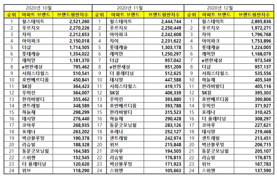 국내 아파트에 대한 브랜드평판 2020년 12월 빅데이터 분석결과, 1위 힐스테이트 2위 푸르지오 3위 자이 순으로 분석되었다.한국기업평판연구소는 24개 아파트 브랜드에 대한 빅데이터 평판
