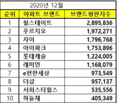 [브랜드평판] 아파트 브랜드 2020년 12월 빅데이터 분석결과...1위 힐스테이트, 2위 푸르지오, 3위