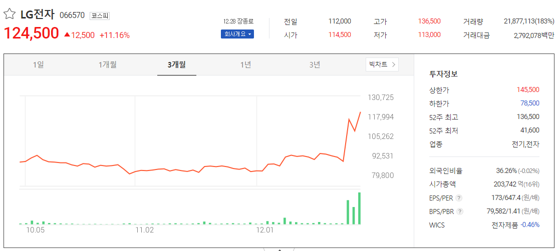 최근 LG전자와 LG전자우 주가가 급등세에 있습니다.