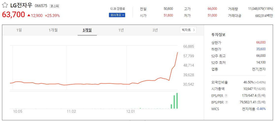 아래는 LG전자와 LG전자우의 최근 3개월 주가차트 흐름입니다. 최근 애플카, 전기차 관련 소식으로 급등하는 차트 모양입니다.