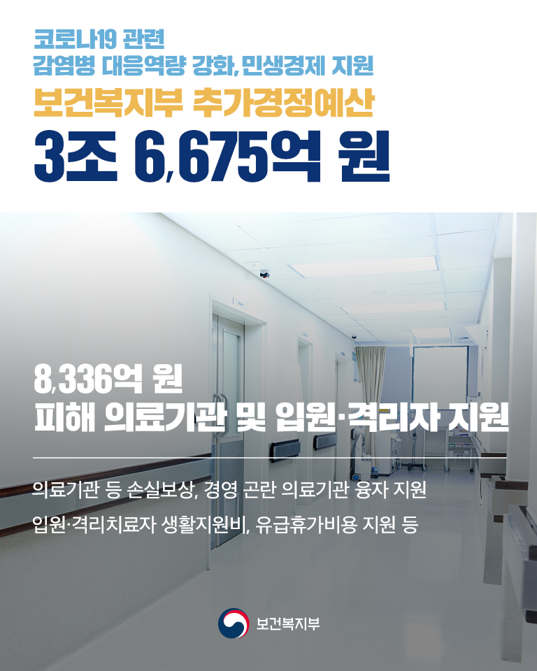 코로나19 관련 감염병 대응역량 강화와 민생경제 지원을 위한 보건복지부 추가경정예산 3조6675억 원 확정되었습니다.